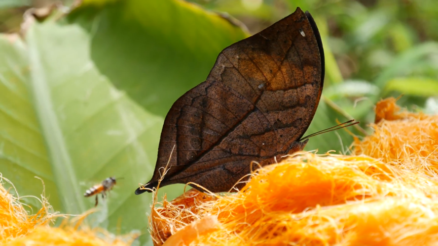 如果说警戒色是“高调防坑”,那隐蔽拟态就是“低调保命”。枯叶蝶是这门技术的“博士后”。它的翅膀反面不仅有枯叶的黄褐色,连叶脉纹路、虫蛀破洞都模仿得丝毫不差。更厉害的是,它停息时会把翅膀折叠成“叶柄”形状,连鸟类的视觉系统都会被骗——科学家在雨林中观察发现,枯叶蝶在落叶堆里的被发现的概率非常低!