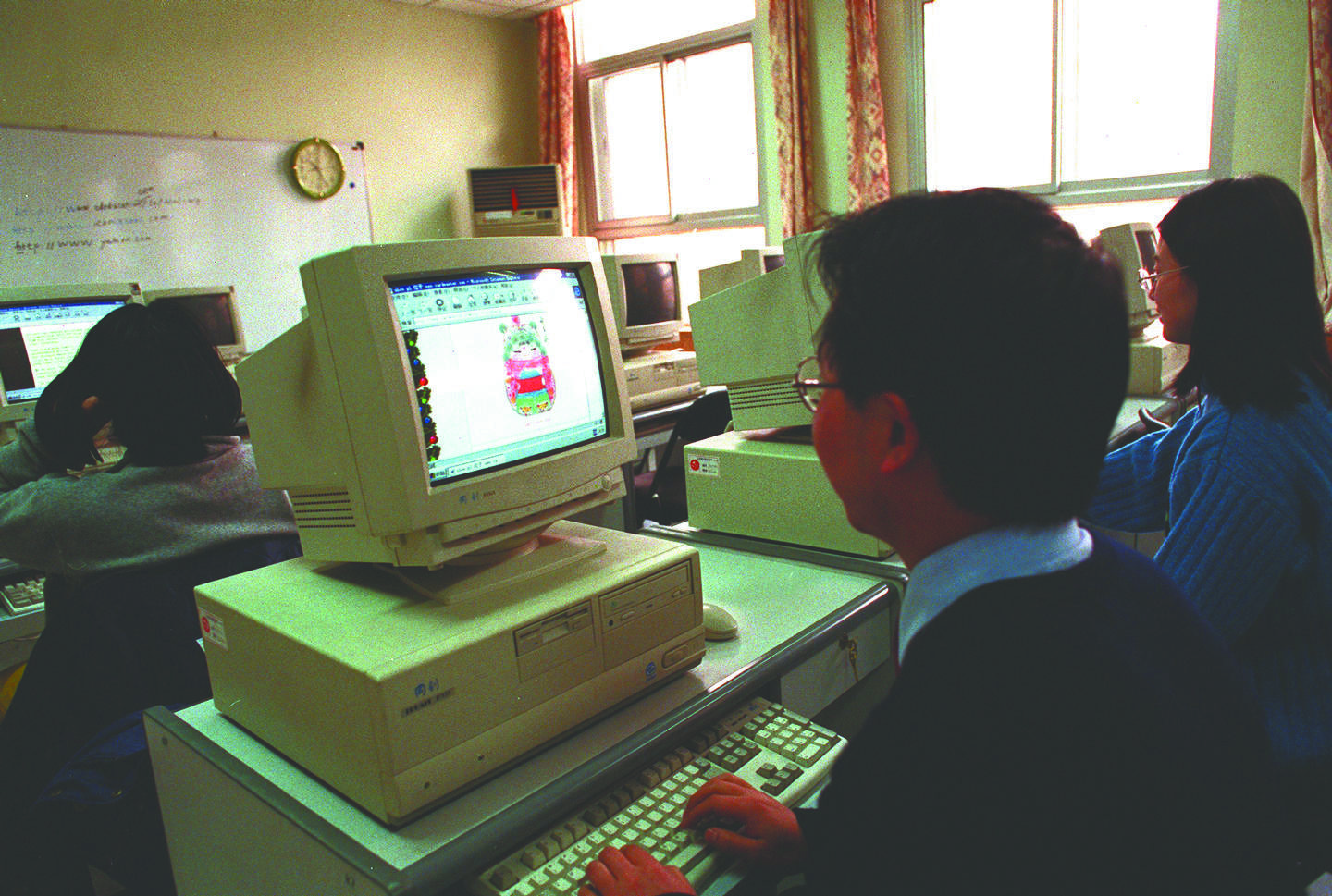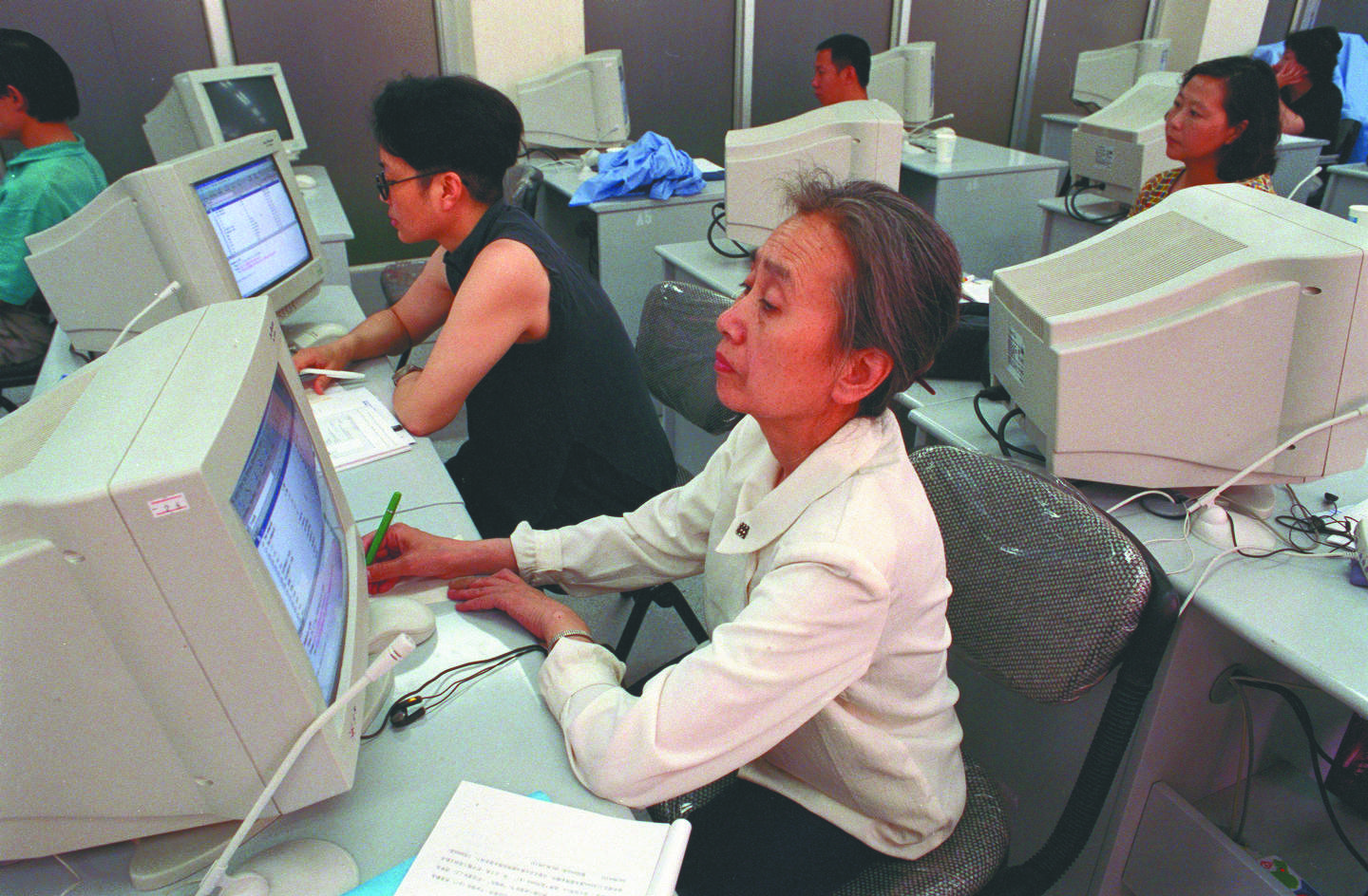 2000年8月,人们在北京一家电脑网络培训班上认真学习
