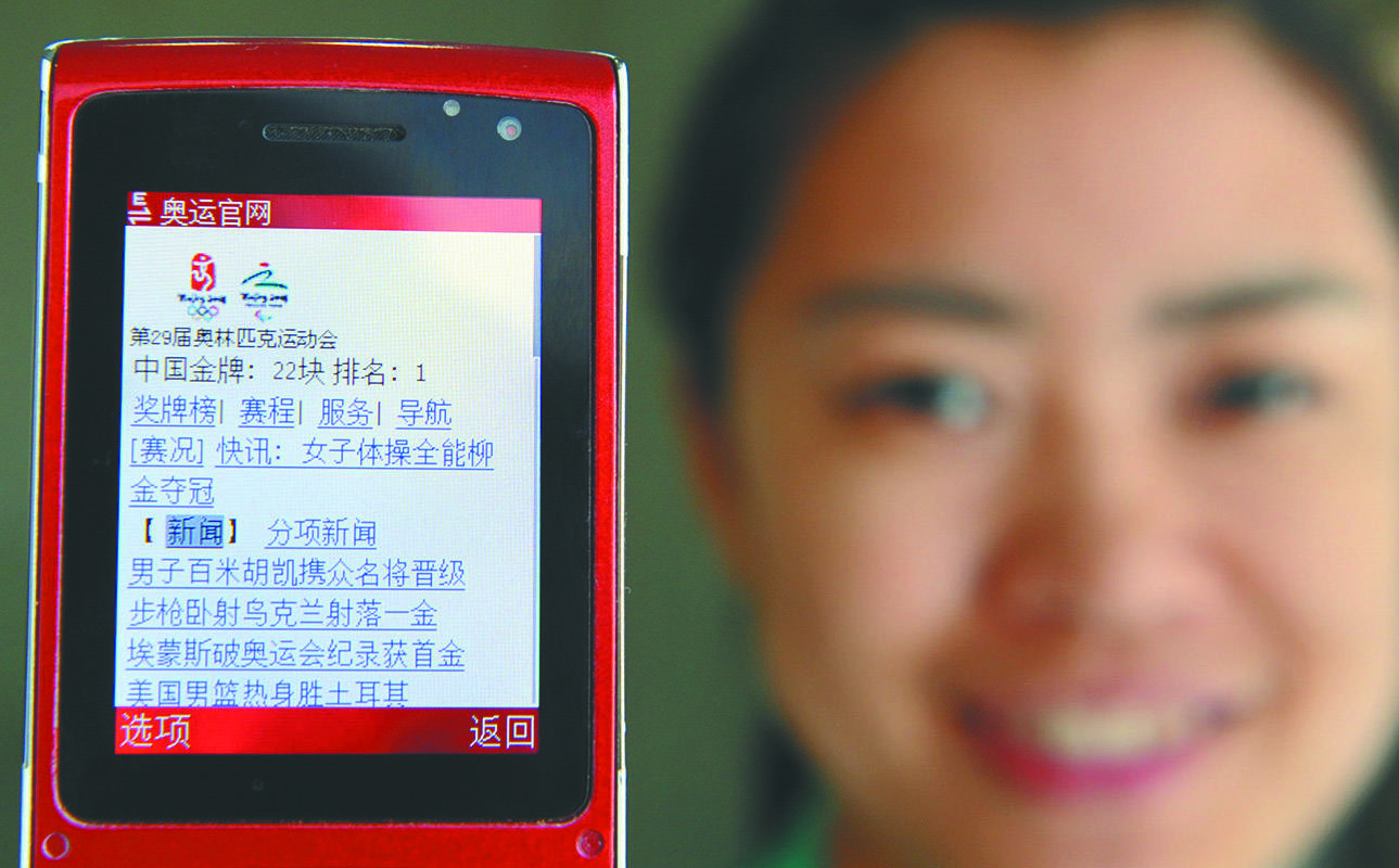 2008年8月15日,一位记者通过手机浏览北京奥运会官方网站