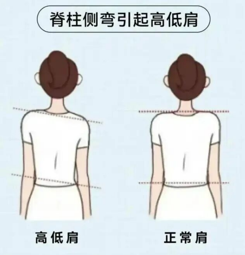 1.脊柱侧弯:尤其是青少年时期未被发现的轻度脊柱侧弯,最终会导致肩膀不对称,如青少年特发性脊柱侧弯(AIS)。