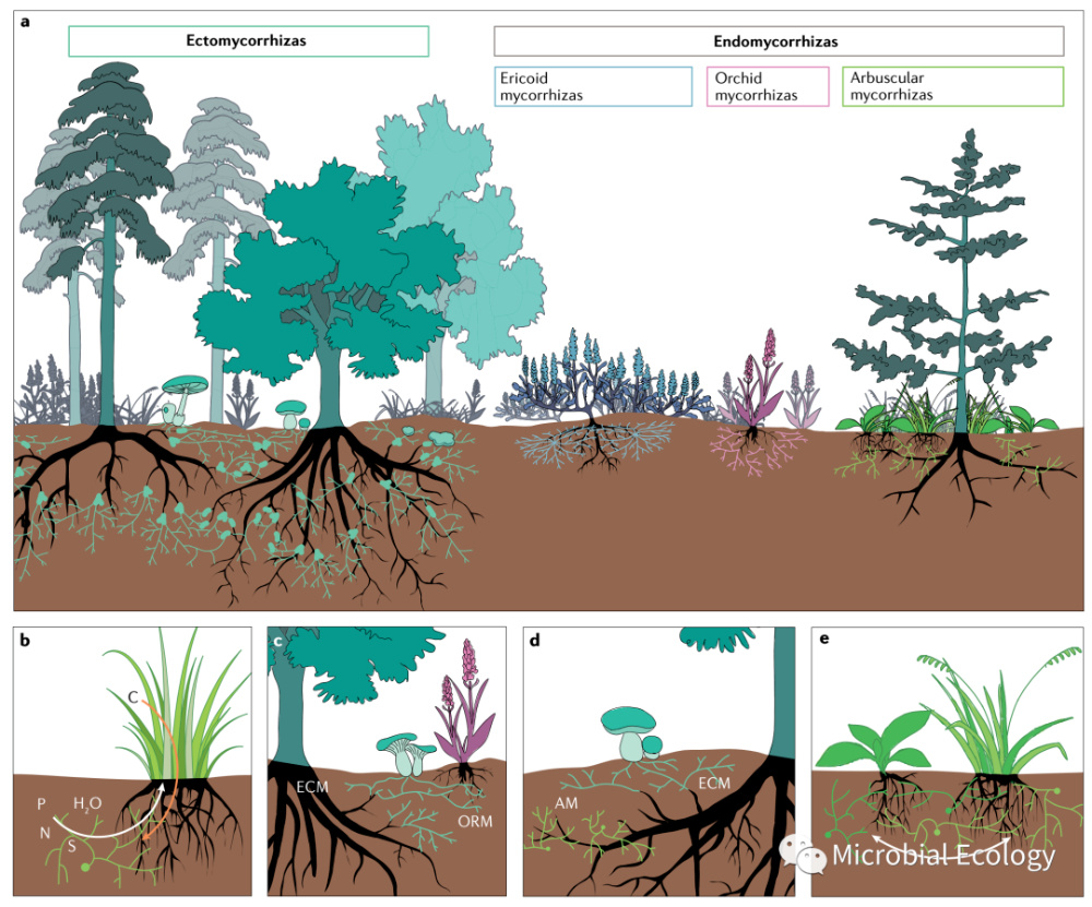 科学家们根据形态特征将菌根分为七大类(外生菌根、丛枝菌根、内外生菌根、兰科菌根、浆果鹃类菌根、水晶兰类菌根及欧石楠类菌根),其中外生菌根(占总数2%)、丛枝菌根(72%)、兰科菌根(10%)和欧石楠类菌根(1.4%)是较为常见的四种类型。虽然外生菌根在植物中占比很小,但它们主要是松科、壳斗科等森林建群树种,因此对森林生态系统影响极大。