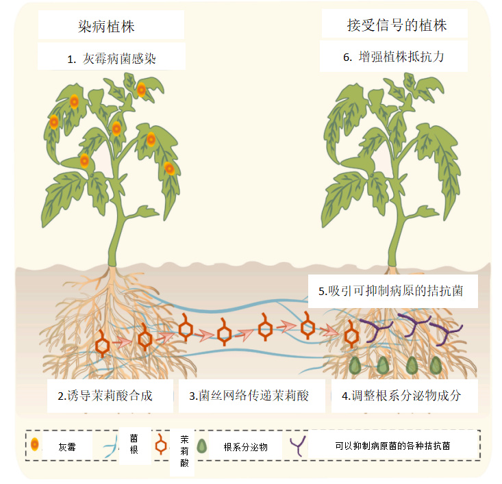 研究人员设计了一个巧妙的“根箱实验”,他们将两个种植番茄的种植箱相邻放置,中间用仅允许菌丝通过(根系不能通过)的尼龙网隔开。当一侧的番茄被灰霉菌感染后,另一侧的健康番茄虽然没有任何直接接触,却表现出了增强的抗病能力。