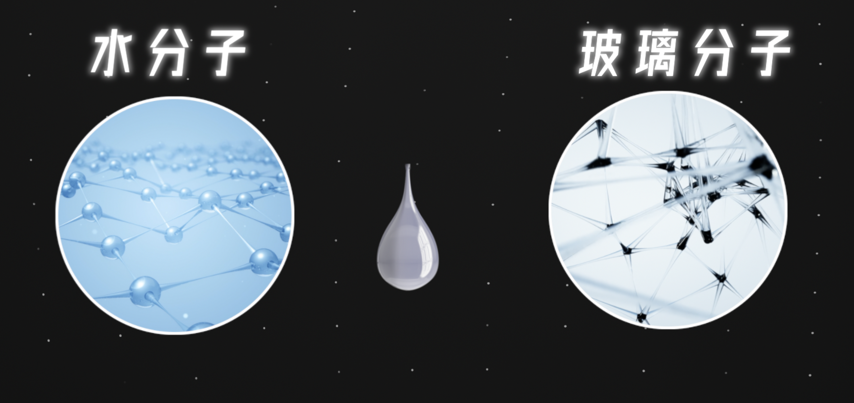 但是也有例外,比如一块擦的很干净的玻璃沾上水之后,你发现水不再聚成水珠了,而是在玻璃上滩成一片,这又是为啥呢?很显然,肯定跟玻璃有关了,当水珠跟玻璃接触的时候,接触部位的水分子外侧就不再处于没人拉扯的状态了,而是多了一群玻璃上的分子,由于玻璃的成分比较复杂,这里就统称玻璃分子,那这时候,接触部位的水分子就要做出选择了,我是继续跟我的水分子小伙伴们一块玩,还是跟新来的这些玻璃分子一块玩呢?或者你可以理解为两边的分子在拔河,争夺中间部位这些水分子,那就看谁的吸引力更大一些了。