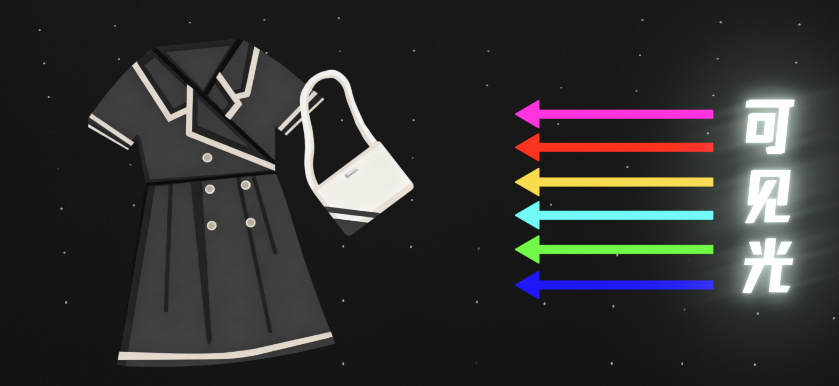 首先思考一个问题,你为什么会看到不同的颜色,是大自然天生就有一个属性叫做颜色吗?并不是,颜色其实是人的一种错觉,我们能看到不同颜色的物体,有两个前提,一是要有光打到物体上,通常就是自然光或者人造的灯光,在一个小黑屋里你是什么也看不见的。第二个前提就是,被光照射的物体表面,得能把光反射出去,当这些反射光射入人的眼睛里,刺激我们的视觉细胞,视觉细胞再把光信号转化为电信号被大脑接收,我们就觉得我们看见东西了。而不同的颜色对应的其实是不同波长的光信号,如果你不了解什么是波长的话,你可以把光想象成是由在空间里传播的一个个波包组成的,也叫电磁波。它就是在空间里不停振荡的电磁场,振荡的快慢就决定了光的波长,而并不是所有波长的光人眼都能看得见。可见光的波长在780纳米到380纳米这个范围内,依次对应红橙黄绿蓝靛紫七种颜色。注意到没有,这里并没有白色和黑色,我们平时看到的白色光,不管是自然光还是人造光,其实是由多种不同颜色的光混合而成的。黑色就更简单了,当没有光射入你的眼睛里时,你看见的就是黑色了。
