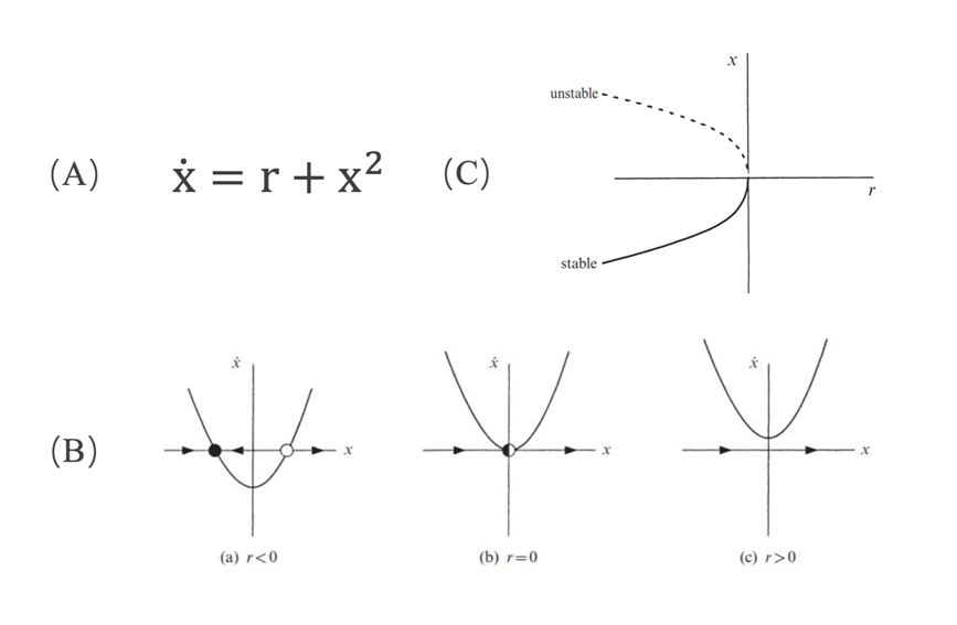 图1:鞍-结点分岔示意图,(A)动力系统的典型微分方程形式,(B)r 变化时分岔的向量场,黑色实心点代表稳定平衡点,空心点代表不稳定平衡点,(C)分岔图