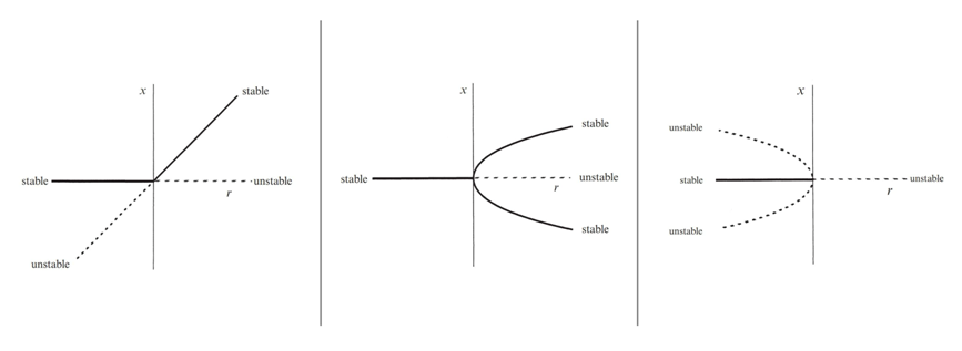 图2:从左到右,依次为跨临界分岔图,超临界叉形分岔图,亚临界叉形分岔图。