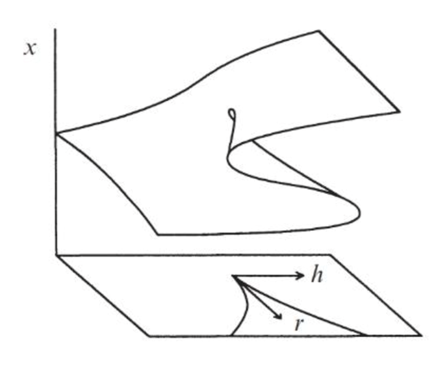 然而,现实世界比这些单参数模型更复杂。如果系统由两个参数控制(即系统的余维数为2),我们会观察到更奇异的行为,比如尖点分岔,如图3所示,这个动力系统的状态在某一区域折成上下两层,从侧面看(投影)就出现分叉曲线。当外部条件(如图中的h)慢慢变化、状态点沿上层走到折边尽头时,它会突然跳到下层,此时就会出现滞后分叉;但如果是固定h,而调节r的话,则会出现我们刚才提到的超临界叉型分叉。尖点分叉很好地将两种不同的分叉统一在一个图像当中,可以用来建模更复杂的突变行为。