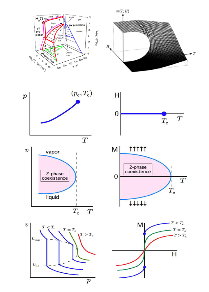 图4:左边为气液相图,右边为伊辛铁磁体相图,最上面两个图分别为水的三维相图和 Ising模型的三维相图,下面六个图为三维相图在不同面上的投影