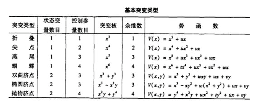 图5:七种基本突变的分类,展示其对应的维数、余维数和势函数