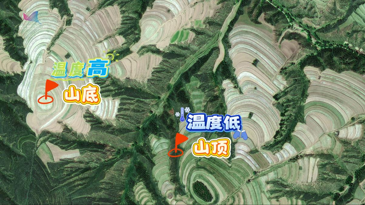 从上景图像可以看到山底温度较高,植被收割比较早,而山顶的温度较低,植被还未被收割。
