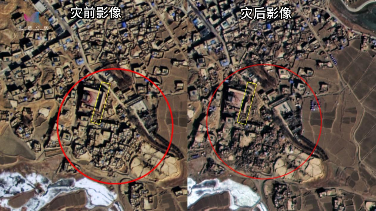 通过以上这两景图像对比可以清晰地看到高楼坍塌前后的情况。左侧是灾前影像,楼体是完整无损的,右侧是灾后影像,楼体已经坍塌。