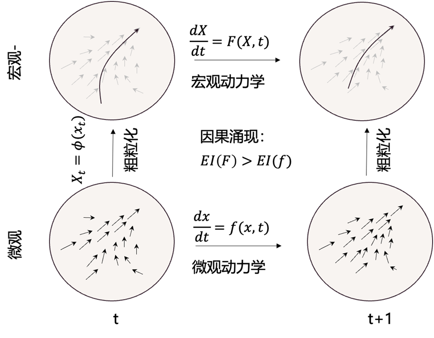图1:因果涌现的理论框架(EI即有效信息,它可以度量一个动力学的因果效应强度)