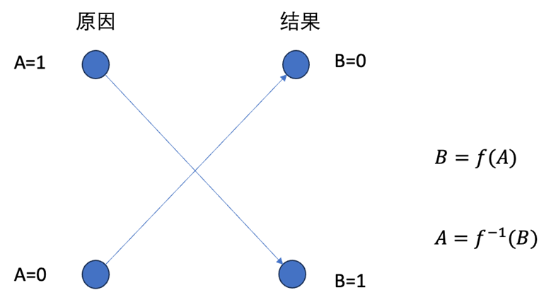 在这个函数关系中,每个变量都只能取0(代表不发生)和1(代表发生)两种可能值。则如果A发生,B确定性地发生;且A不发生,B确定性地不发生,那么A和B之间就建立了一个一一映射关系,f这个函数就是可逆的。这种可逆性可以体现为,如果我看到了B是否发生,我必然能够推断出A是否发生。由此可见,因果性本身就暗含了一种可逆的函数映射。