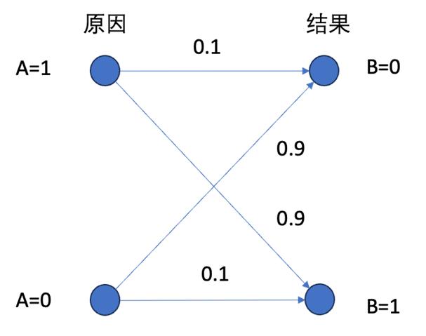 假如当A发生的时候,B有很大的概率会发生,但是也会以一定小的概率(例如0.1的概率)不发生;反过来A不发生的时候,B会以较大的概率不发生,但仍然会以小的概率发生,如图4所示的情况:
