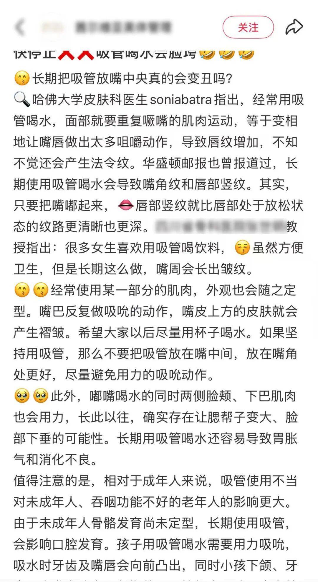 有人解释其背后的“原理”——使用吸管的时候,面部会重复噘嘴的肌肉运动,等于变相让嘴唇做出太多咀嚼动作,导致上面的多种皱纹。有些骨科教授也持相同看法。