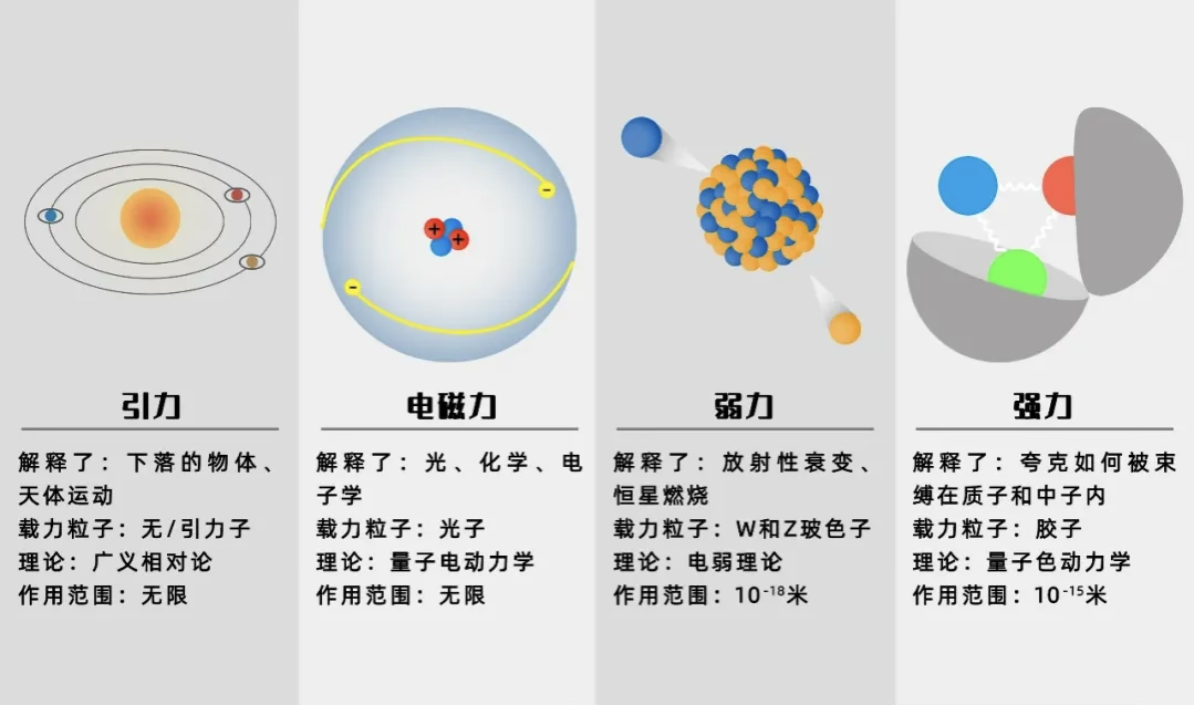 引力、电磁力、弱力和强力,是自然界中已知的四种基本相互作用。它们在不同的尺度下各司其职,共同支配着宇宙万物的运行。