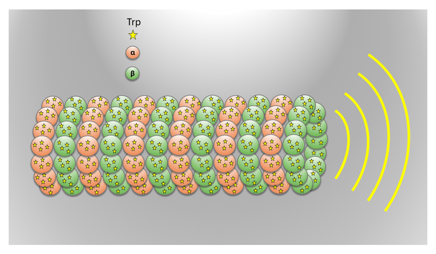 (注:上图是由αβ-微管蛋白二聚体形成的圆柱形微管结构的示意图,突出显示色氨酸网络。其中,α为橙色,β为绿色Trp残基被描绘为星星,展示了它们集体发光的现象,这与超辐射相关;出处为原文)