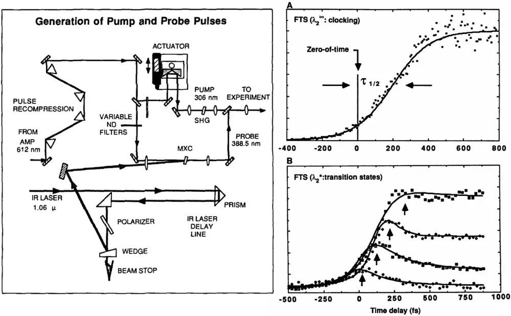 除此之外,要把瞬态谱学的时间分辨率推至飞秒量级还面临不少困难。其中最重要的,不仅是产生飞秒宽度的泵浦脉冲,更要协调脉冲宽度与其能量展宽之间的不确定性关系ΔtΔE ≥ h/2π。在稳态谱学中,超大的Δt不妨碍样品在光照下跃迁至确定的电子/振动激发态(ΔE可忽略)。但是,如果泵浦脉冲的宽度仅为50 fs,则对应的能量展宽可达数百波数,与分子振动的能隙相当。因此,飞秒级的泵浦脉冲将不可避免地令反应物在初始电子激发态内占据多个相邻的振动能级,对后续的观测造成不利影响。所幸的是,获得稳定的飞秒泵浦脉冲、调控泵浦/探测脉冲的延迟间隔、克服泵浦脉冲的能级展宽等挑战,在二十世纪八十年代被逐一解决。其中牵涉的核心人物,是加州理工学院的埃及裔美国化学家、“飞秒化学”概念的提出者泽维尔(A. H. Zewail)。