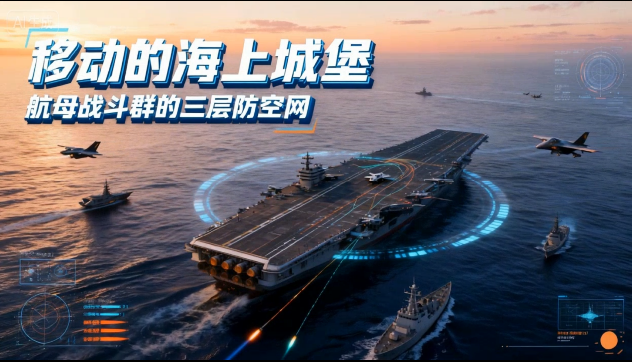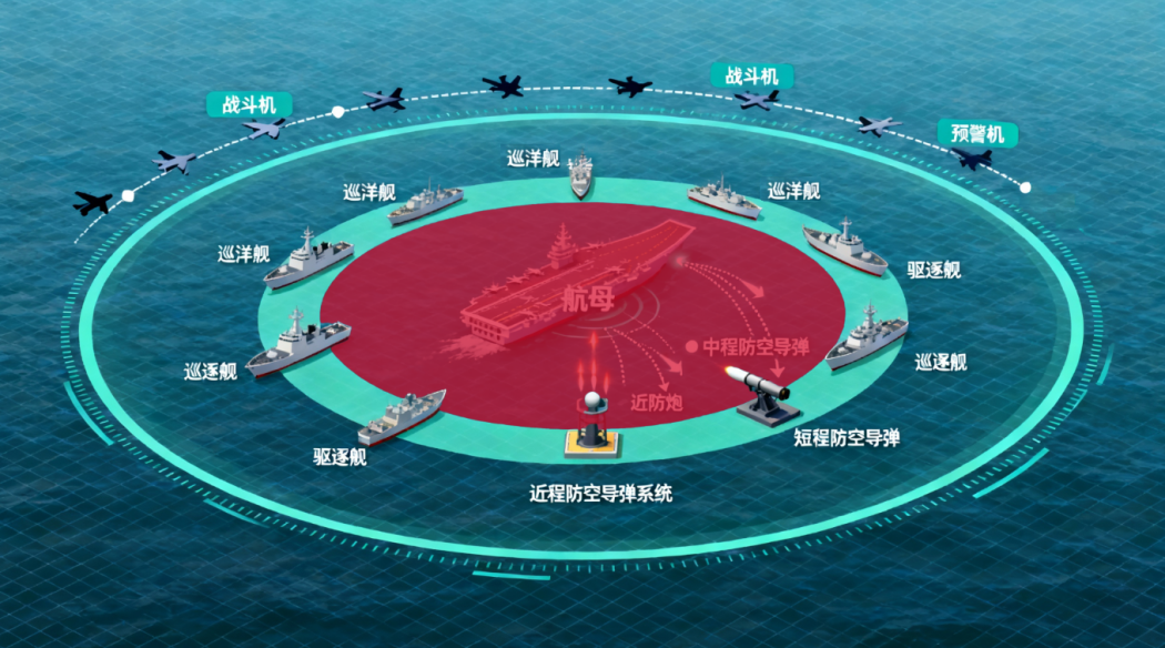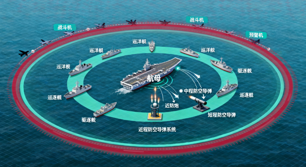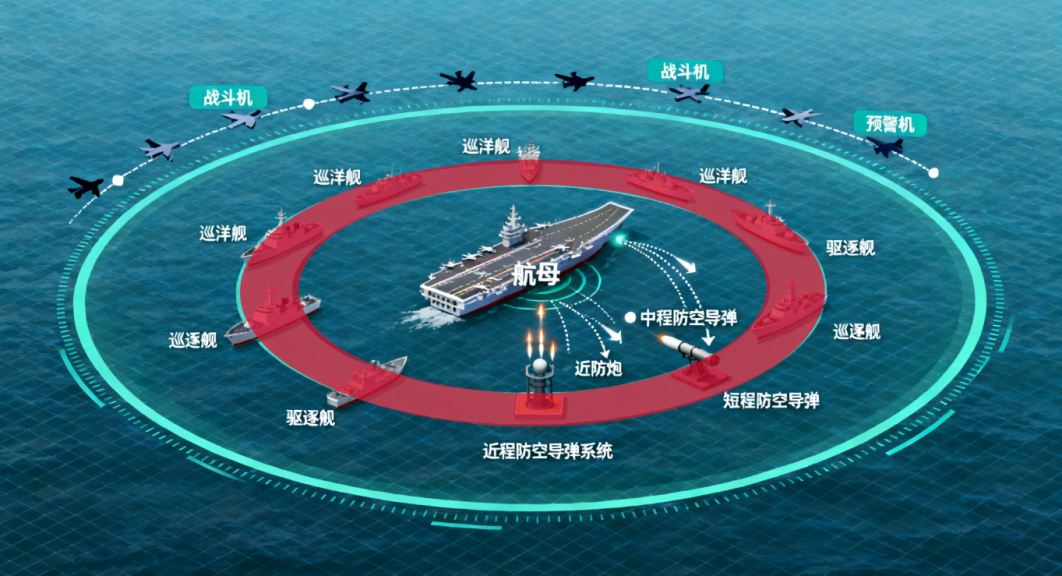 一般来说,航母战斗群的防空体系采用三层防空网设计,通过不同层级的防御系统构建全方位防护体系。