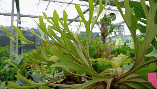 然后,我们再看它下垂的这部分叶片。叶片分裂成长条状,像分叉的鹿角,这便是鹿角蕨用于繁殖的“生殖叶”,也叫孢子叶。在这些“鹿角”的背面或边缘,我们能看到一些褐色的斑块,这些可不是病害,而是鹿角蕨的孢子囊群,里面蕴藏着无数微小的生殖细胞——孢子。当孢子成熟,它们会随风飘散,开启一场寻找新家园的冒险。只要条件合适,一颗微小的孢子就能在另一棵树的树皮上,萌发出新的生命。