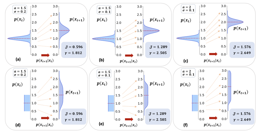 我们以高斯映射(x_(t+1)=ax_t+ϵ,这里ϵ是一个高斯噪音,方差为σ)为例,展示了因果效应强度(有效信息J)与近似动力学可逆性(γ)的相关性,如图5所示,每张图的左侧为因变量的分布,右侧为果变量的分布。图5从左到右,因果效应逐渐增强,近似动力学可逆性也在增强。上下对应的两张图中的动力学相同,但是输入分布不同,因此它们的因果效应强度和动力学可逆性也都完全相同,即动力学可逆性只与动力学有关。