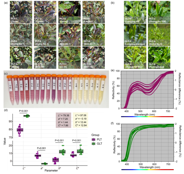 图1. 紫叶茶(PLT)和绿叶茶(GLT)的视觉表征。(a)PLT茶鲜叶、(b)GLT茶鲜叶、(c)茶汤的视觉外观、(d)茶汤的色度参数、(e)PLT茶汤的可见反射光谱和(f)GLT茶汤的可见反射光谱。