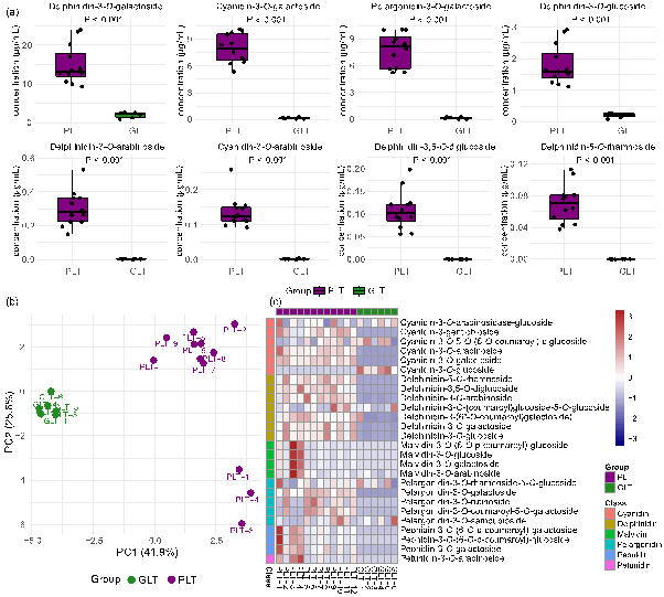 (a)PLT和GLT茶汤中关键花青素的浓度,(b)茶汤中关键花青素的PCA得分图,(c)以及茶汤中关键花青素的热图。