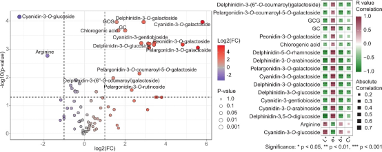 (a)茶汤中鉴定的化合物的火山图,(b)以及关键差异化合物与茶汤色度参数之间的相关性热图。