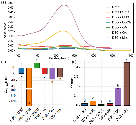 (a)D3G与共色素混合物的紫外-可见光谱(400-700 nm),(b)最大吸收波长(Δλmax)的变化,(c)以及混合D3G与共色素后吸光度(ΔAmax)的变化。