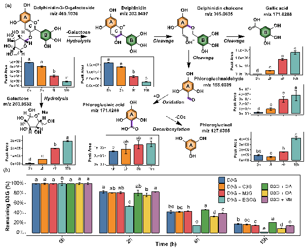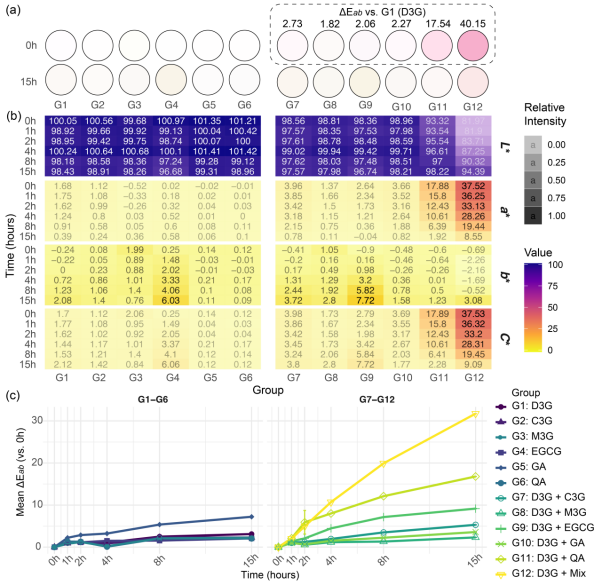 (a)模拟的单组分(G1-G6)和混合组分(G7-G12)溶液的视觉颜色,(b)不同热处理时间段内颜色参数的变化,(c)以及相对于0 h的ΔEab随时间的变化。(a)D3G的热降解途径和(b)共色素组中D3G的定量保留率。