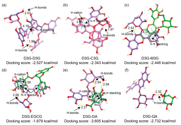 图7. D3G与共色素(C3G、M3G、EGCG、GA和QA)的分子对接模拟。相互作用的颜色呈现如下:氢键(黄色虚线)、π-π相互作用(蓝色虚线)、π-阳离子(绿色虚线)。