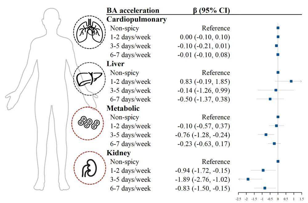 辣为何可能牵动我们的“身体时钟”?其实,这关键在辣椒素与 TRPV1 受体的互动:这种刺激不只停留在舌尖,它会牵引钙离子内流、炎症通路与代谢信号,进而影响能量利用、血脂与血糖等与衰老密切相关的环节[2]。有了这条生物学线索,才有意义去追问:经常吃辣的人,生物学层面的衰老是否真的更慢?为回答这个问题,研究者从中国多民族队列(CMEC)里选取了 7,874 名完成基线与随访的成年人,以过去一个月的吃辣频率作为暴露,分析心肺、代谢、肝脏、肾脏的综合生物学年龄变化[1]。结果相当耐人寻味:与很少或不吃辣的人相比,每周吃辣 3–5 次的人,综合生物学年龄的加速值下降约 0.69 岁;每周 6–7 次的降幅约 0.32 岁,1–2 次下降不显著[1]。分系统看,优势更集中在代谢和肾脏:每周 3–5 次与更慢的代谢系统老化(-0.76 岁)和肾脏老化(-1.89 岁)相关,而心肺与肝脏的差异较小或不稳定。