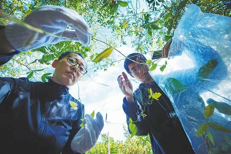 2024年1月30日,郑晓明博士(左)和张步云博士在深山密林中采集野生稻的伴生物种。伴生物种可以为科学家提供疣粒稻野生种群所处生境的类型和现状等信息。