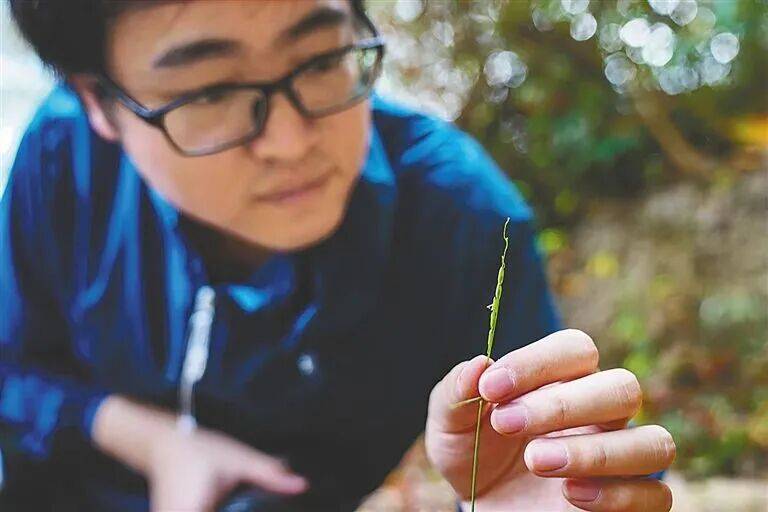 2024年1月30日,一株疣粒野生稻在三亚山区被发现后,张谢勇博士仔细观察其表型性状。