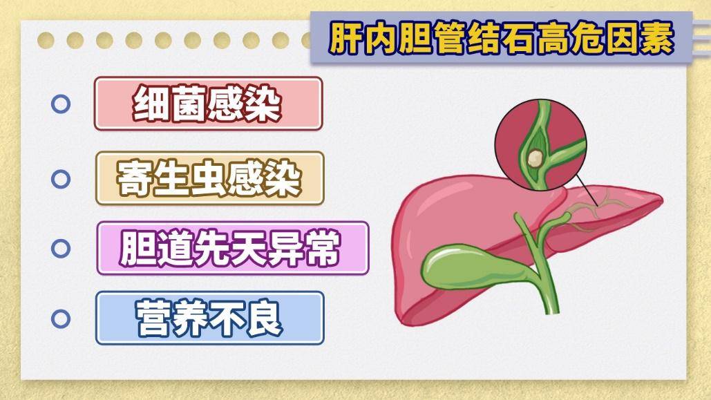 肝内胆管结石的形成具有多重因素。1.细菌感染。肠道细菌通过胆道逆行进入肝内胆管,与胆汁成分结合,形成结石核心。2.寄生虫感染。寄生虫在胆管内产卵,以虫卵为核心形成结石。两种寄生虫较为常见。蛔虫通过污染食物传播,肝吸虫存在于生食的鱼类中。3.胆道先天异常。胆管狭窄或扩张导致胆汁流出不畅, 胆汁淤积促进结石形成。4.营养不良。蛋白质摄入不足导致胆汁成分异常,增加结石形成风险。某些地区蛋白质摄入不足仍然是肝内胆管结石的重要诱因。