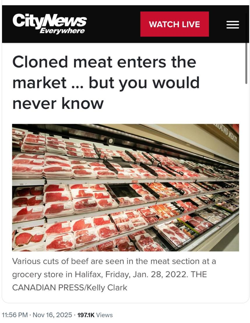 加拿大在公众几乎毫无察觉的情况下,成为全球首批允许克隆动物后代肉类进入市场的国家之一。2025年11月初,该国肉食工业界的一位领导提醒消费者,根据加拿大卫生部的最新政策,克隆动物的肉和奶“不再被归类为新型食品”——企业可像销售普通肉品一样,将其直接摆上超市货架,无需额外审批,也不用张贴“克隆来源”的特殊标签。