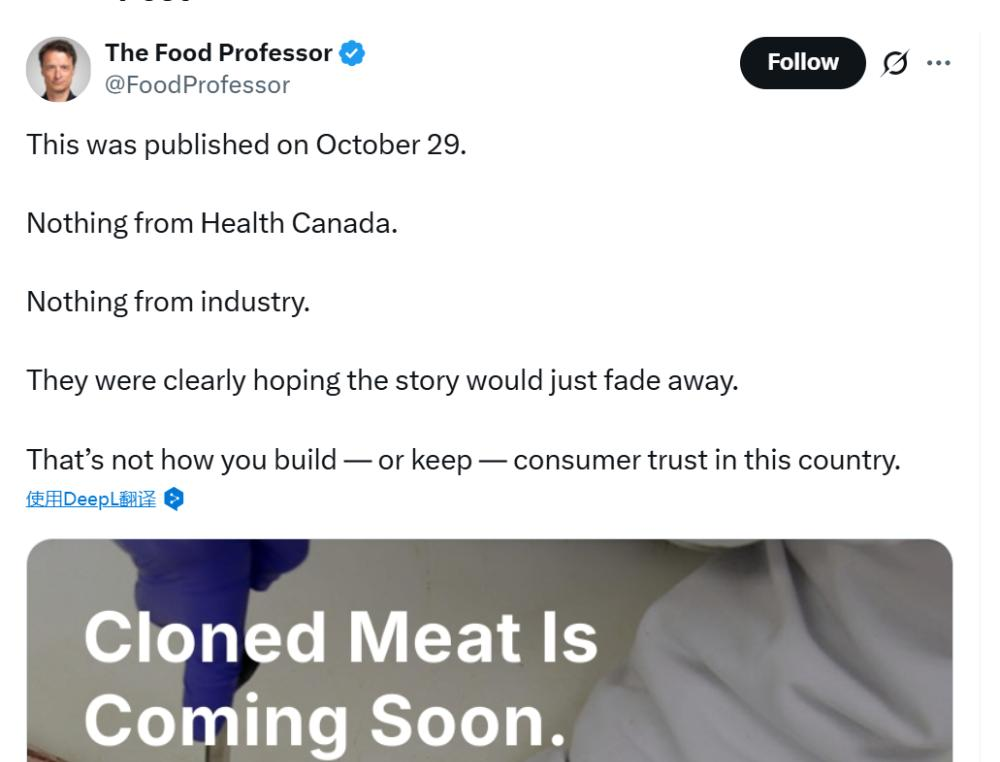 图3 加拿大政府在缺乏任何公开说明的情况下悄然批准克隆肉进入食品供应链。该国食品学者Sylvain Charlebois批评这种不透明、缺乏对消费者解释的操作方式。