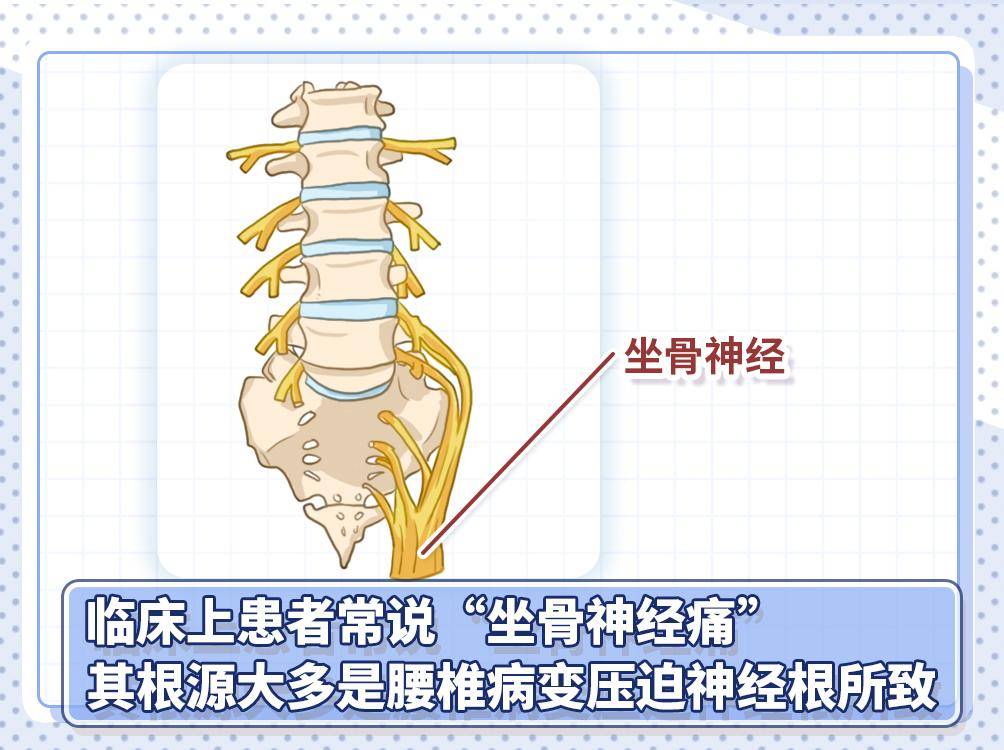 以下方图片为例:白色部分为腰椎,黄色结构代表神经根,红色凸起则是突出的椎间盘。早期突出可能仅对神经根产生“刺激”,比如运动时症状明显,休息后刺激减轻,症状便会缓解。但病情加重后,突出会演变为“持续压迫”,此时即使休息,症状也难以缓解。这些下腰段的黄色神经根最终汇聚形成坐骨神经,临床上患者常说的“坐骨神经痛”,其根源大多是腰椎病变压迫神经根所致。