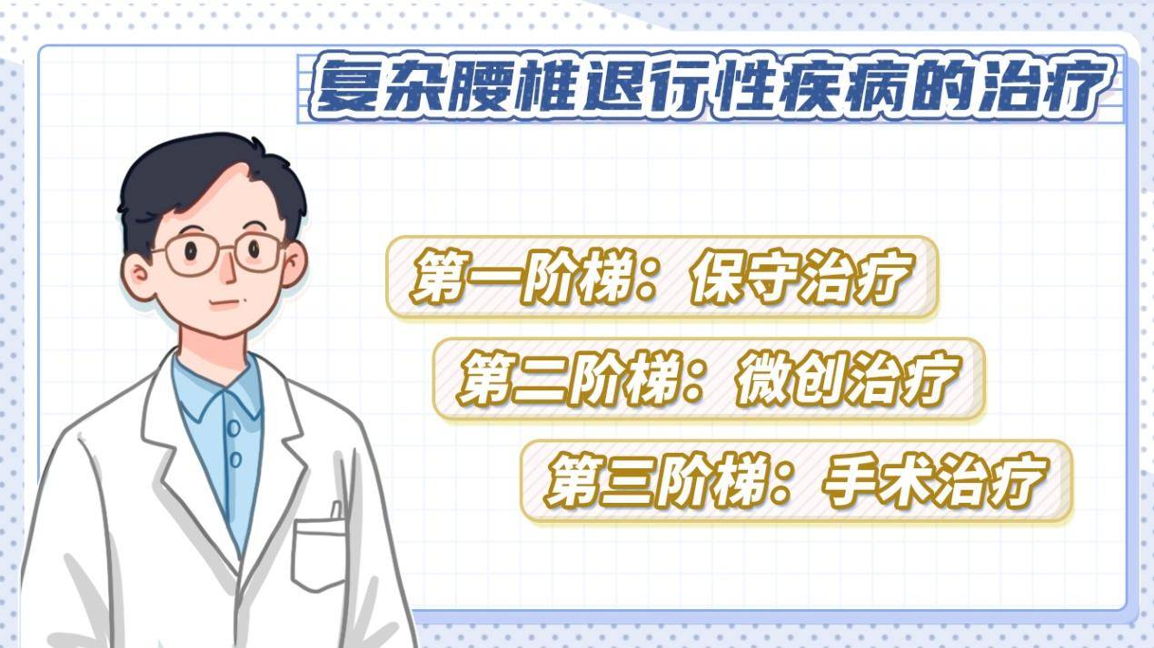 复杂腰椎退行性疾病的治疗遵循“阶梯治疗”原则,即从保守治疗开始,逐步过渡到微创治疗,最后考虑开放手术。大多数时候,规范的保守治疗无效时才考虑手术治疗。