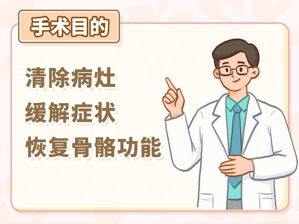 手术的规模和方式根据病情而定,从简单的穿刺引流脓液,到清除病灶内的坏死组织,再到针对骨骼不稳定或神经压迫进行的固定、减压手术等,目的都是清除病灶、缓解症状、恢复骨骼功能。