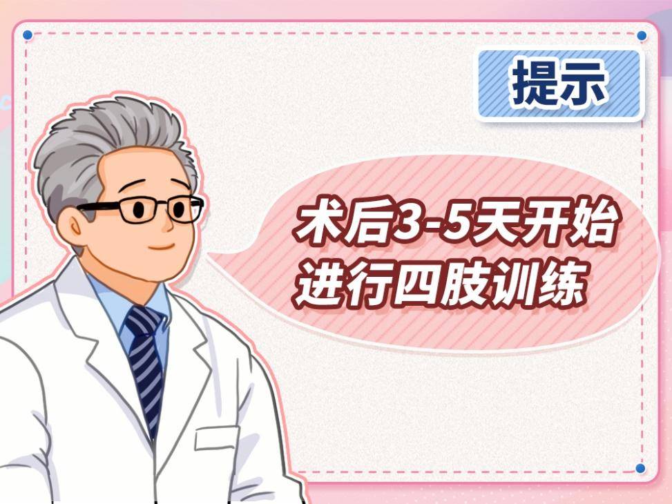 术后刚结束时,不建议立即对腰椎、胸椎等病变部位进行锻炼,一般在术后3-5天开始进行四肢训练。
