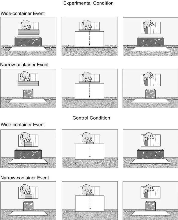 图示的上面部分流程,实验者将木块放到大盒子里,揭开白板后,婴儿并没有表示震惊,因为它展示的是一个符合预期的情况:木块可以被较大的容器装下,所以就看不见了。