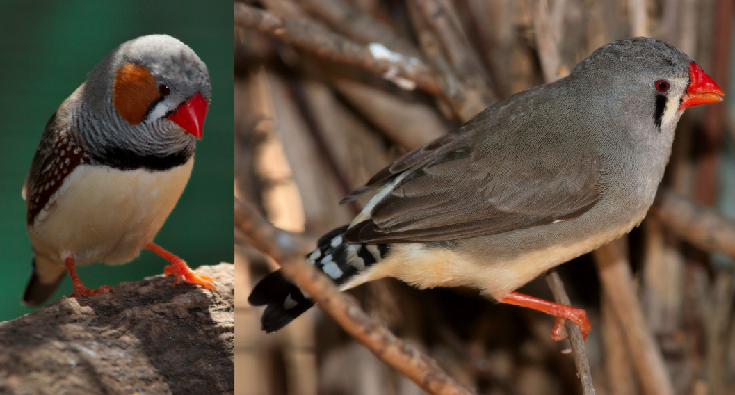 斑胸草雀雌雄的体色与花纹不同。雄鸟(左)从喉部到上胸部具有细密的黑白条纹,因此英文名为“Zebra Finch(斑马雀)”。雄鸟的脸颊呈橙色,下胸部有一道黑色横纹。此外,雄鸟的嘴和腿的颜色比雌鸟(右)更深(图片来源:维基百科)