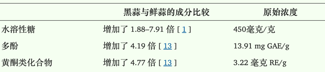 加工成黑蒜后,营养成分发生一定的变化,主要是刺激性的大蒜素降低,抗氧化成分增加,可溶性多糖增加[2]。
