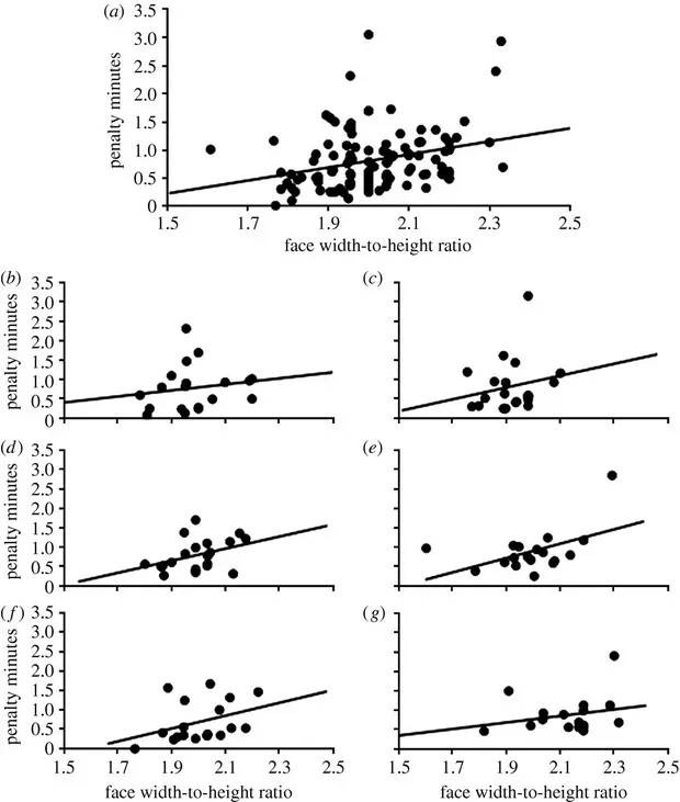 六支加拿大球队的男性职业曲棍球运动员的面部宽高比和攻击性行为之间的关系: (a) 总体分析,b-g单独球队分析,图源:参考文献[3]