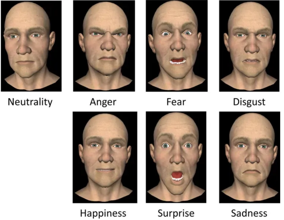 人类是面部非常明显的生物,面部表情在我们的交流沟通中传达了许多信息,因此我们自然可以从丰富的面部表情中寻找到信息,比如下图是中性表情和六种基本情感的3D模拟,相信大家可以自然从其中感受到相应的情绪[6]。
