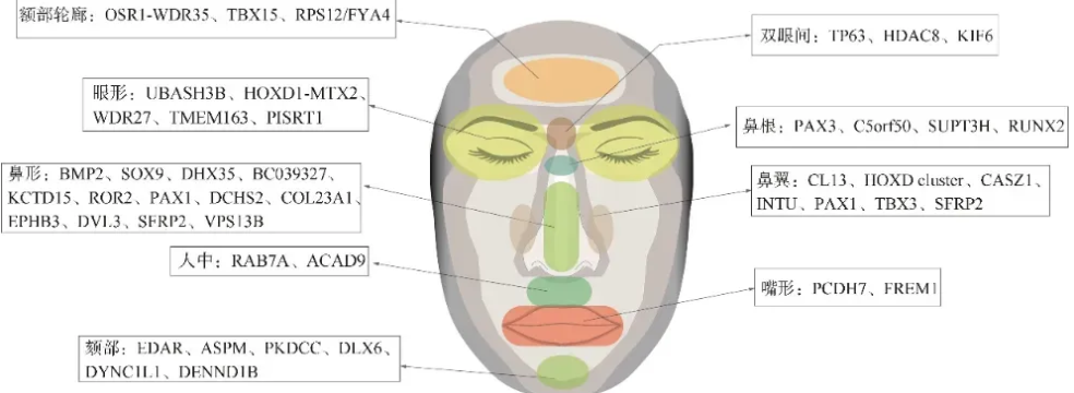 尽管我们目前无法精确定位到哪些基因位点是对面部特征负责,但是根据相关研究,目前已经发现诸多基因位点是和面部特征具有相关性,如面部轮廓是和TBX15、RPS12/FYA4有关,眼形和UBASH3B、WDR27等有关,BMP2、SOX9、DHX35等基因则控制着鼻子的形状等[7]。