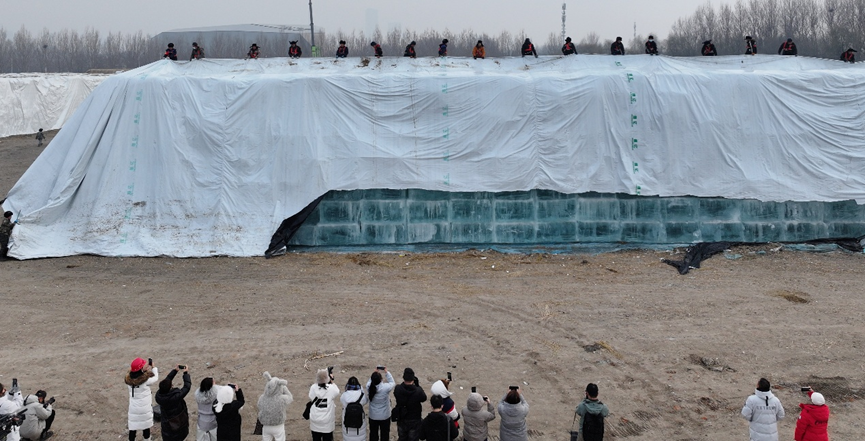 11月24日,备受关注的第二十七届哈尔滨冰雪大世界存冰正式启用,覆盖了长达10个月之久的“厚棉被”被逐层揭开,精心保护的一座座“冰山”显露真容。