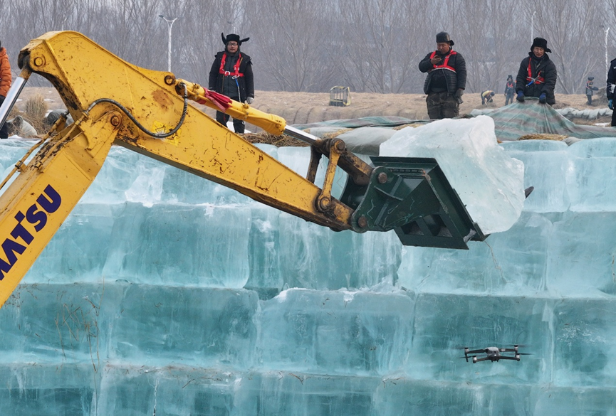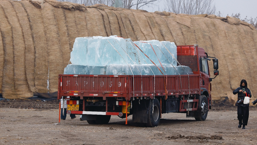 14时30分,哈尔滨冰雪大世界存冰场内,作业车辆在冰垛间忙碌穿梭。随着吊车、铲车、叉车接力作业,冰垛上的冰体被一块块拆解下来。
