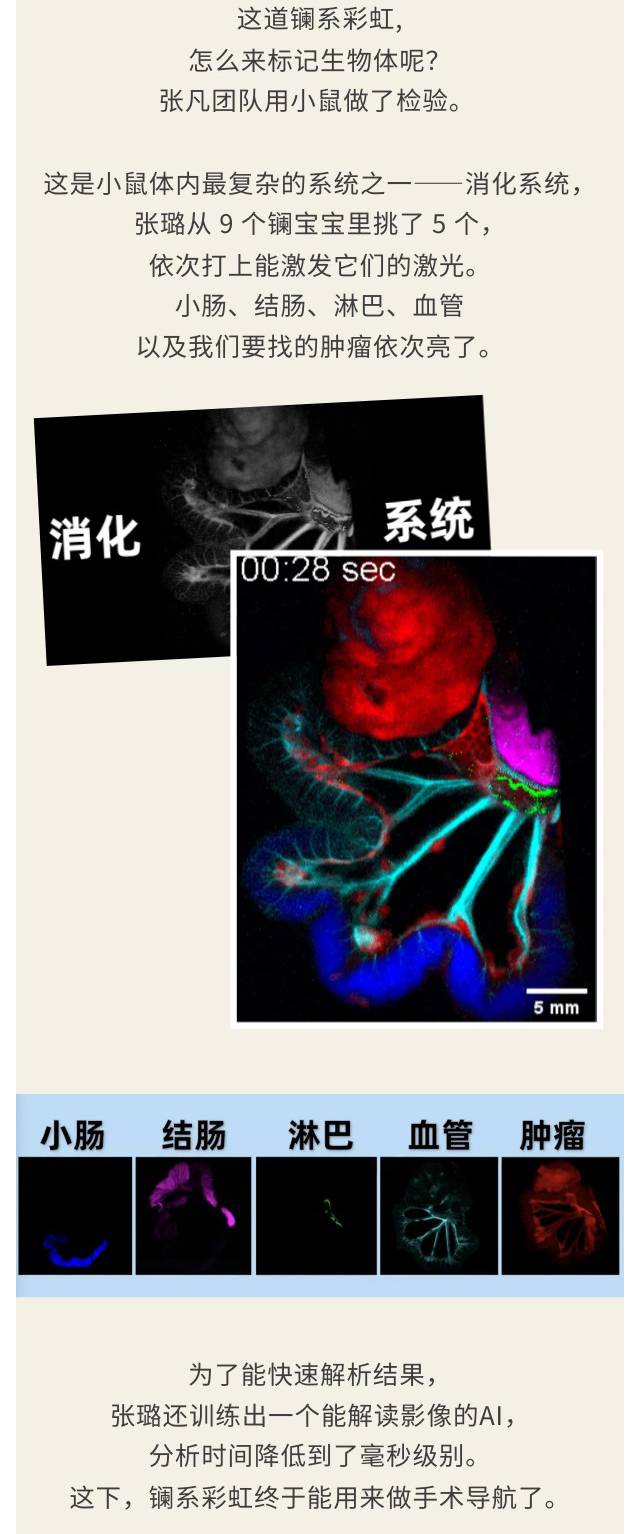 复旦大学研发的研发的镧系彩虹(Lanbow)是一种新型荧光分子调色板,能实现多通道、高分辨率的深层组织成像,并结合人工智能算法实现实时动态手术导航。